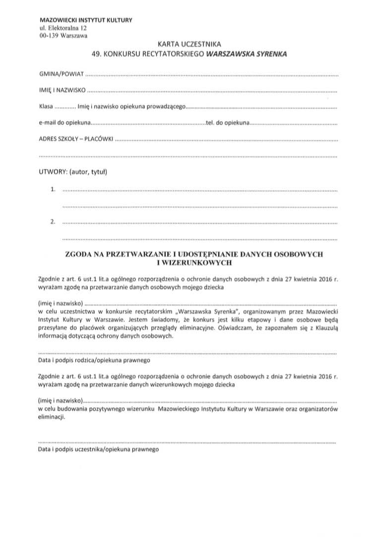 Każdy uczestnik zobowiązany jest wypełnić formularz zgłoszenia oraz zapoznać się z regulaminem konkursu.