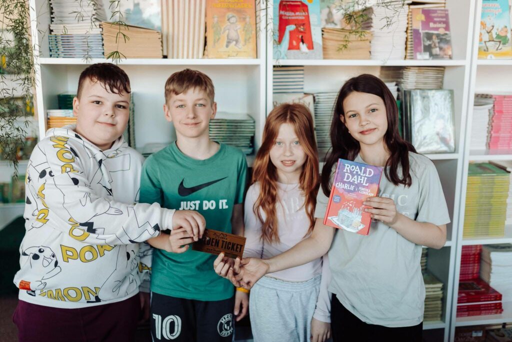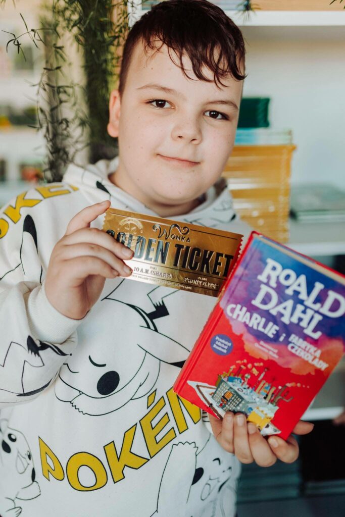 Na zakończenie omawiania lektury „Charlie i fabryka czekolady” klasa 4b wzięła udział w aktywności podsumowującej – „Czekoladowym labiryncie”. Była to lekcja biblioteczna, podczas której uczniowie wcielili się w rolę bibliotekarzy, których zadaniem jest odnajdywanie wybranych pozycji. Uczestnicy, pracując w grupach, ścigali się w poszukiwaniu złotego biletu, a wskazówki były ukryte w książkach. Kluczem do sukcesu okazało się uważne czytanie ze zrozumieniem oraz umiejętność wychwytywania z tekstu najważniejszych informacji.
